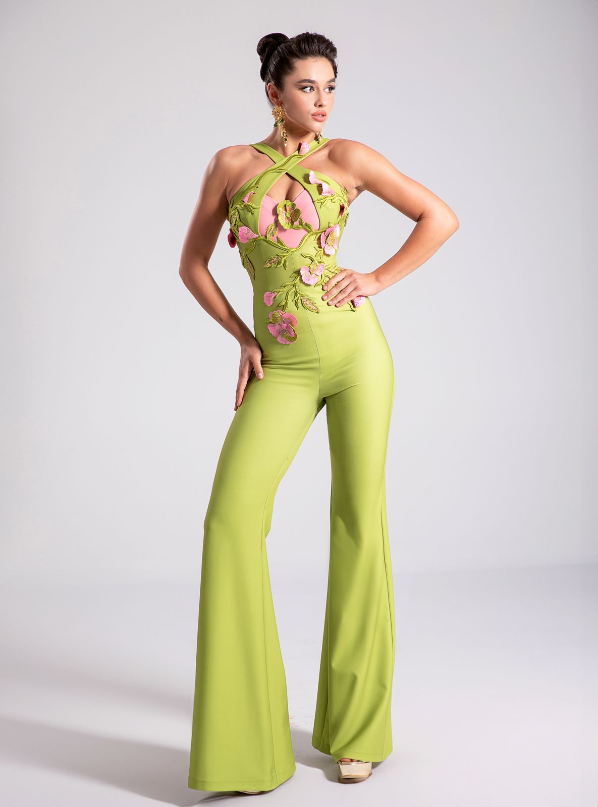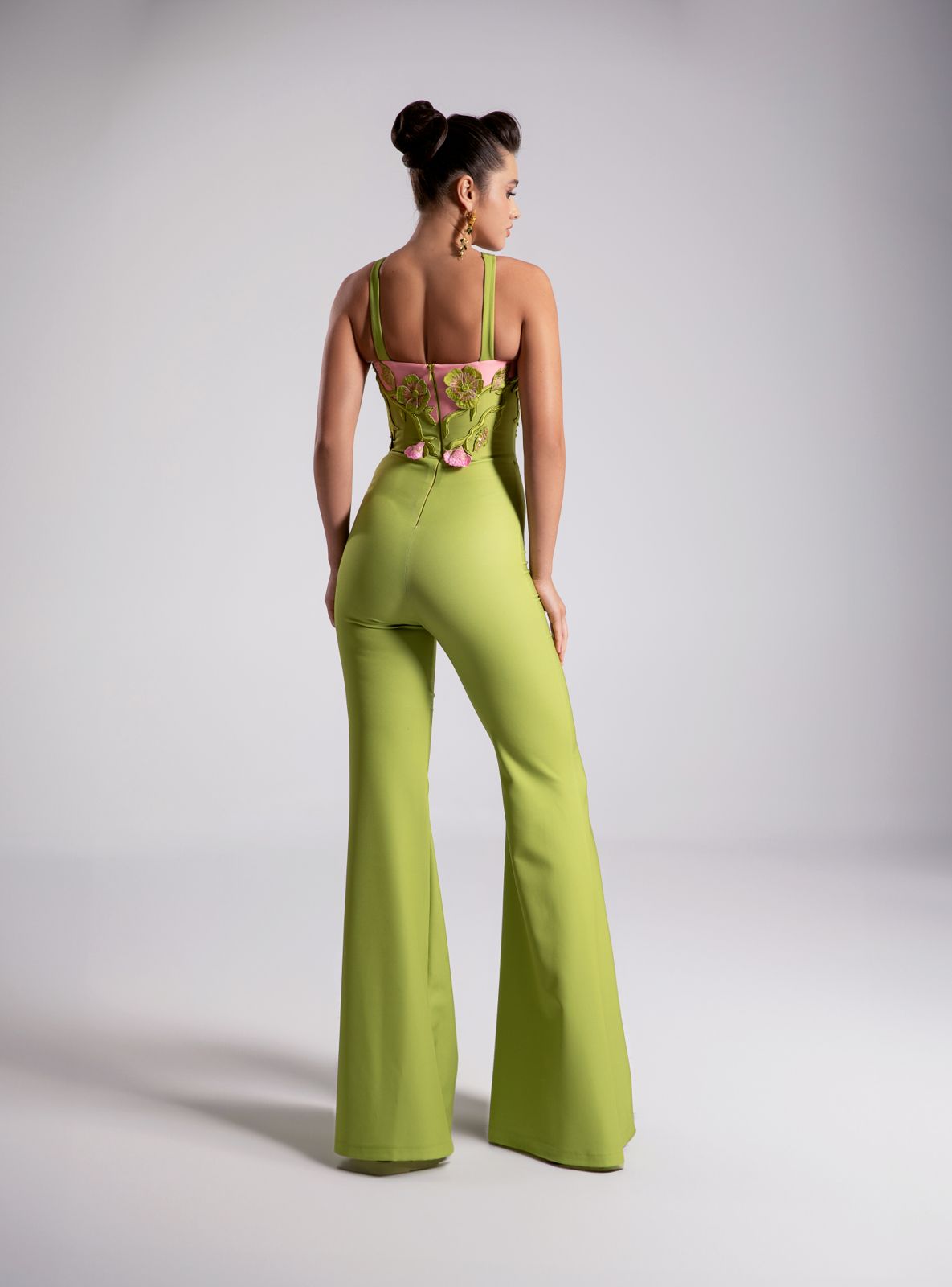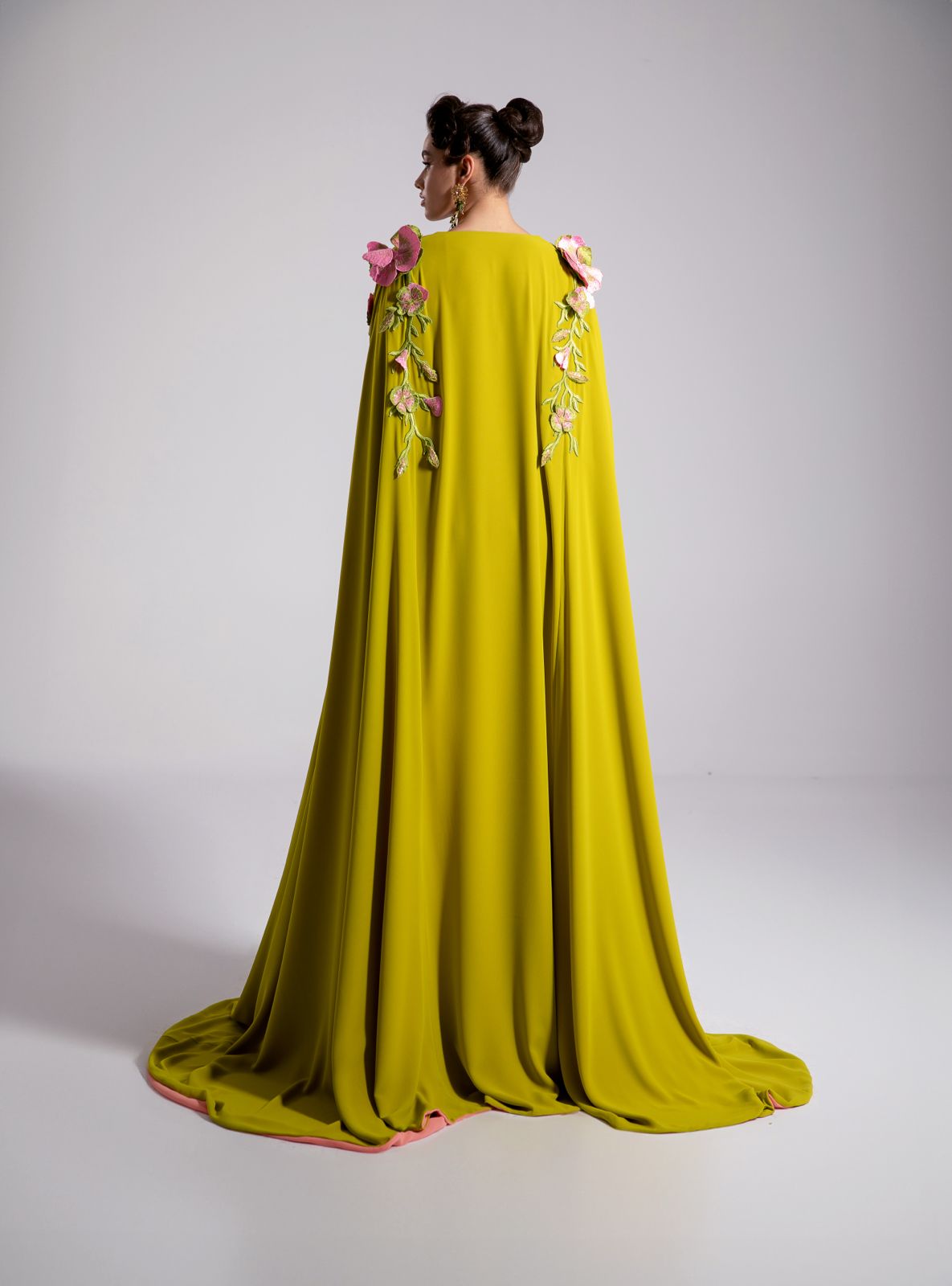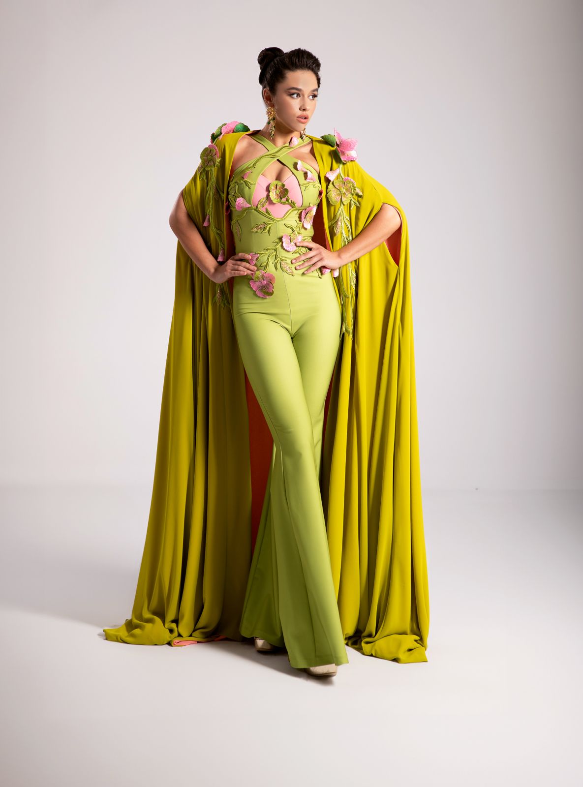 جمبسوت بلون أخضر مصفر نابض بالحياة يمزج بين الحداثة المنحوتة والأنوثة الشاعرية. صُمم ليمنح القوام طولاً بفضل ساقيه الواسعتين، ويتميز بتطريز زهري ثلاثي الأبعاد متقن بدرجات اللونين الوردي الفاتح والوردي الفاتح، يمتد على الصدر ويمتد إلى الظهر. يتميز خط العنق بأشرطة متقاطعة وفتحة ناعمة، مما يضفي عليه لمسة حسية جريئة وراقية. ويكتمل المظهر بكاب طويل بلون متناسق ينسدل من الكتفين، بطياته المنسدلة المزينة بتطريزات من الكرمة والبتلات، مما يحول الحركة إلى أداء فني. طقم مميز للمرأة التي تمزج بين القوة والدراما الرومانسية.