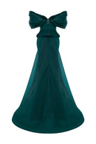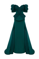 A dramatic couture gown in crepe and organza, defined by its sculptural corseted bodice with woven detailing. The off-shoulder draped sleeves frame the neckline, while the contoured waist blooms into a structured peplum knot design. A long organza train spills from the back, adding power, elegance, and movement to the silhouette.
