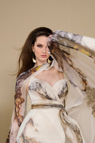 The bodice is shaped in soft white crepe with a sculpted v neckline, wrapped by delicately printed chiffon in mist-like strokes of grey, beige, and bronze. The chiffon continues into sweeping cape-sleeves, creating a dramatic wing-effect that trails behind with effortless grace. At the waist, a matching printed chiffon belt is finished with gold beaded embroidery, adding a touch of radiant luxury. The skirt falls clean and refined for a statuesque finish.