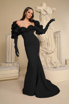 فستان أنيق وجريء من الكريب القرمزي النابض بالحياة، ينبض بالشغف والأنوثة الخالدة. صُمم ببوليرو قصير الأكمام قابل للفصل ، ويتألق بكشكشة من الأورجانزا متعددة الطبقات على طول خط العنق، وزخارف زهرية ثلاثية الأبعاد واسعة على الأكمام. يوازن تصميم حورية البحر الأنيق بين الرومانسية والقوة المعمارية، بينما تُكمل القفازات المتناسقة الإطلالة بأناقة راقية.