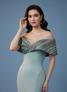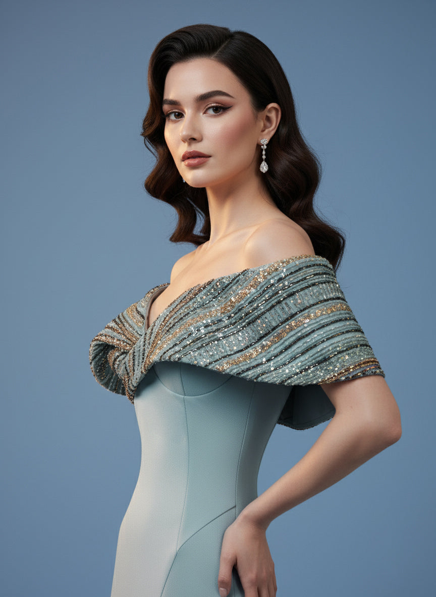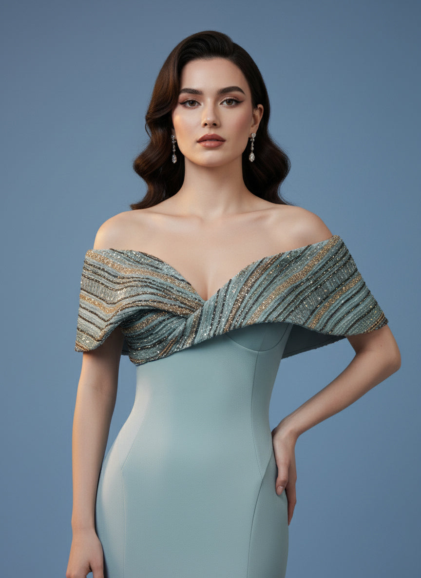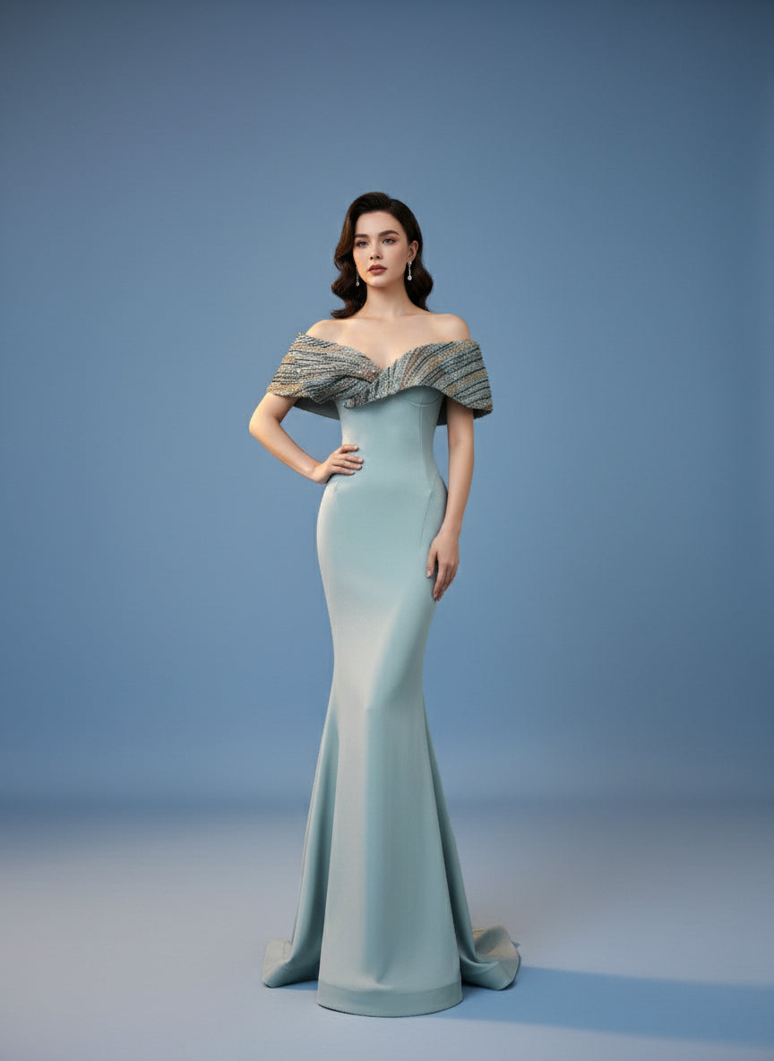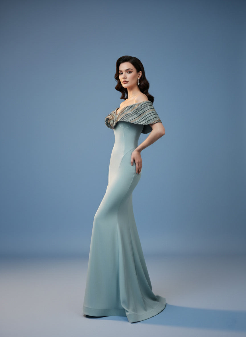 فستان أنيق مصنوع من الكريب الناعم بلون زيتوني أنيق، بتصميم حورية البحر الأنيق. ياقة مكشوفة الكتفين مزينة بطبقة خارجية من الخرز المتقن، مما يضفي لمعانًا وعمقًا ويبرز جمال الصدر المنحوت. يتدفق التصميم الضيق إلى حاشية أنيقة واسعة، ليجمع بين البساطة العصرية وتفاصيل الأزياء الراقية الخالدة.