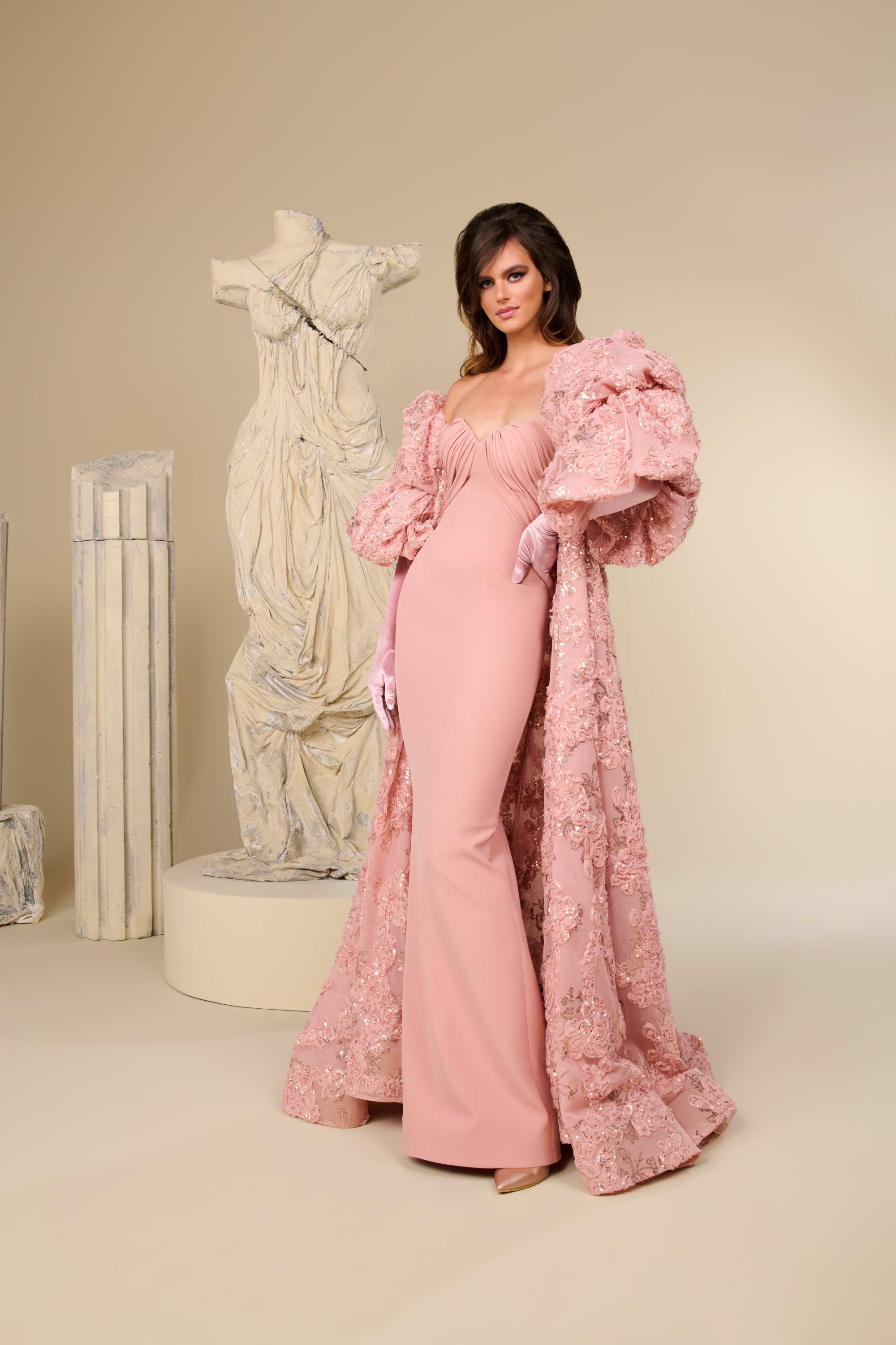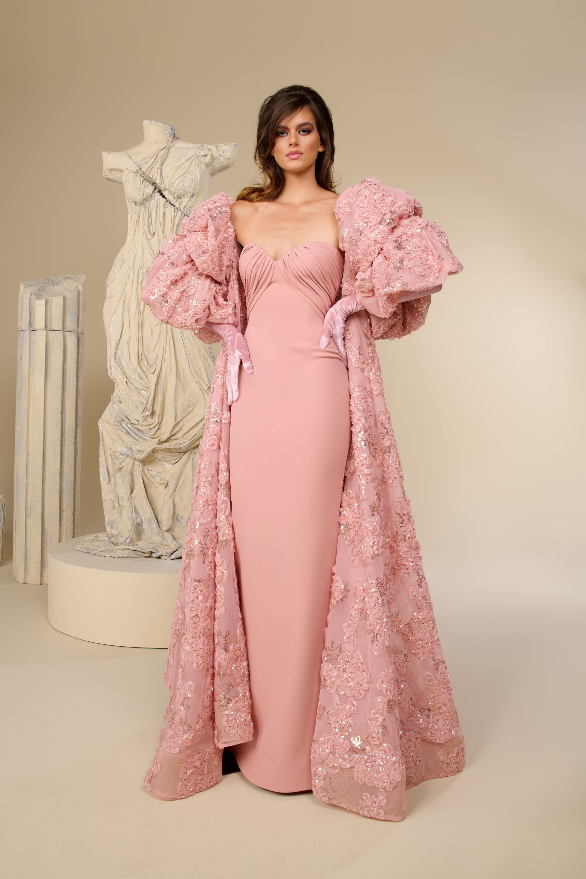 A refined blush gown that marries minimal elegance with couture grandeur. The inner dress is crafted from crepe, featuring a strapless neckline with delicately draped detailing across the bust for a sculpted finish. Draped over it, a voluminous crep cape in tulle embroidered with floral sequin embellishments adds dramatic presence and regal charm. Optional velvet gloves complete the look, enhancing the sense of vintage sophistication with a modern twist.