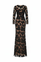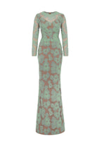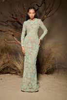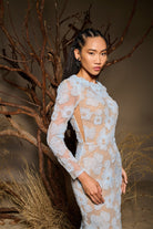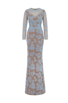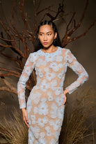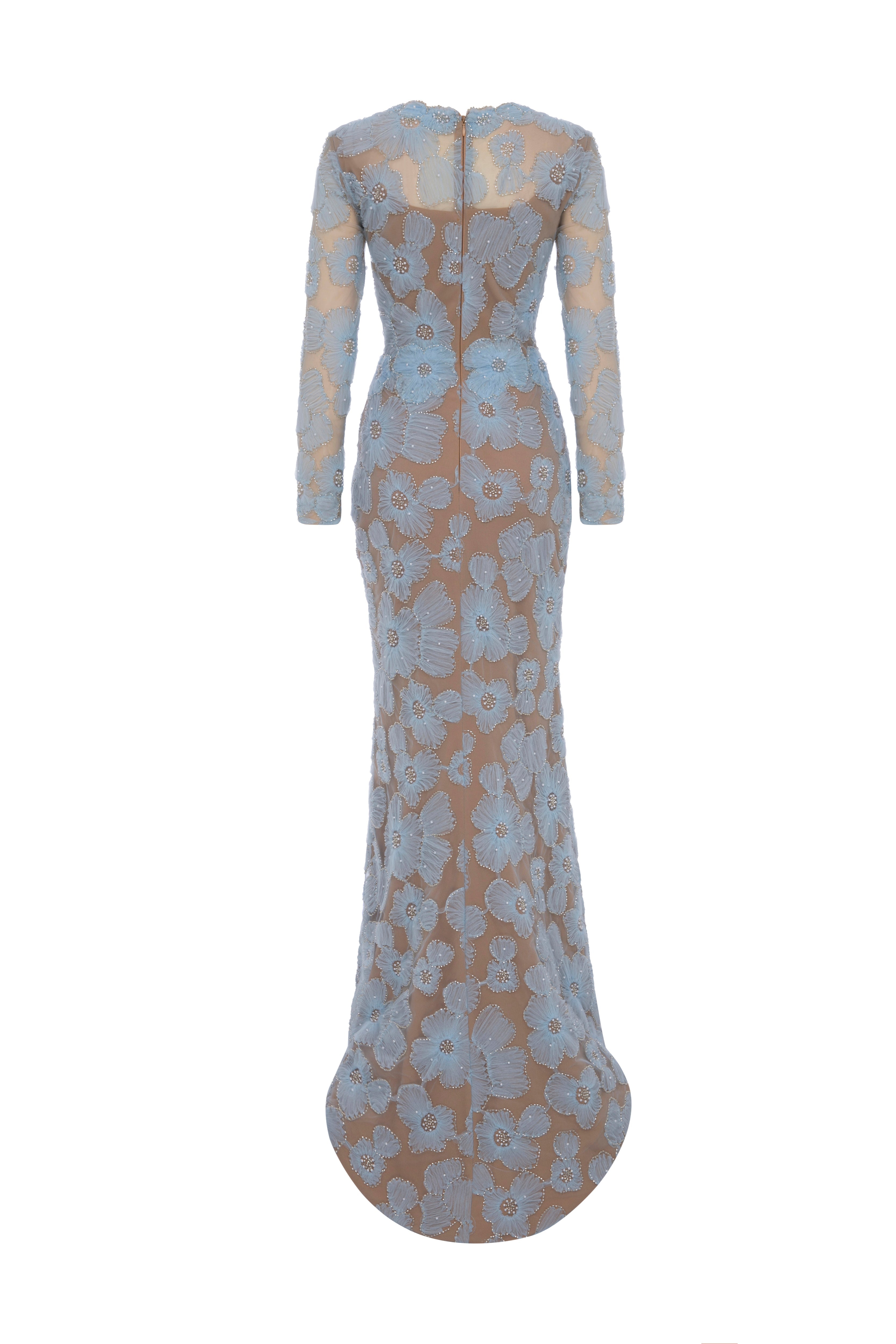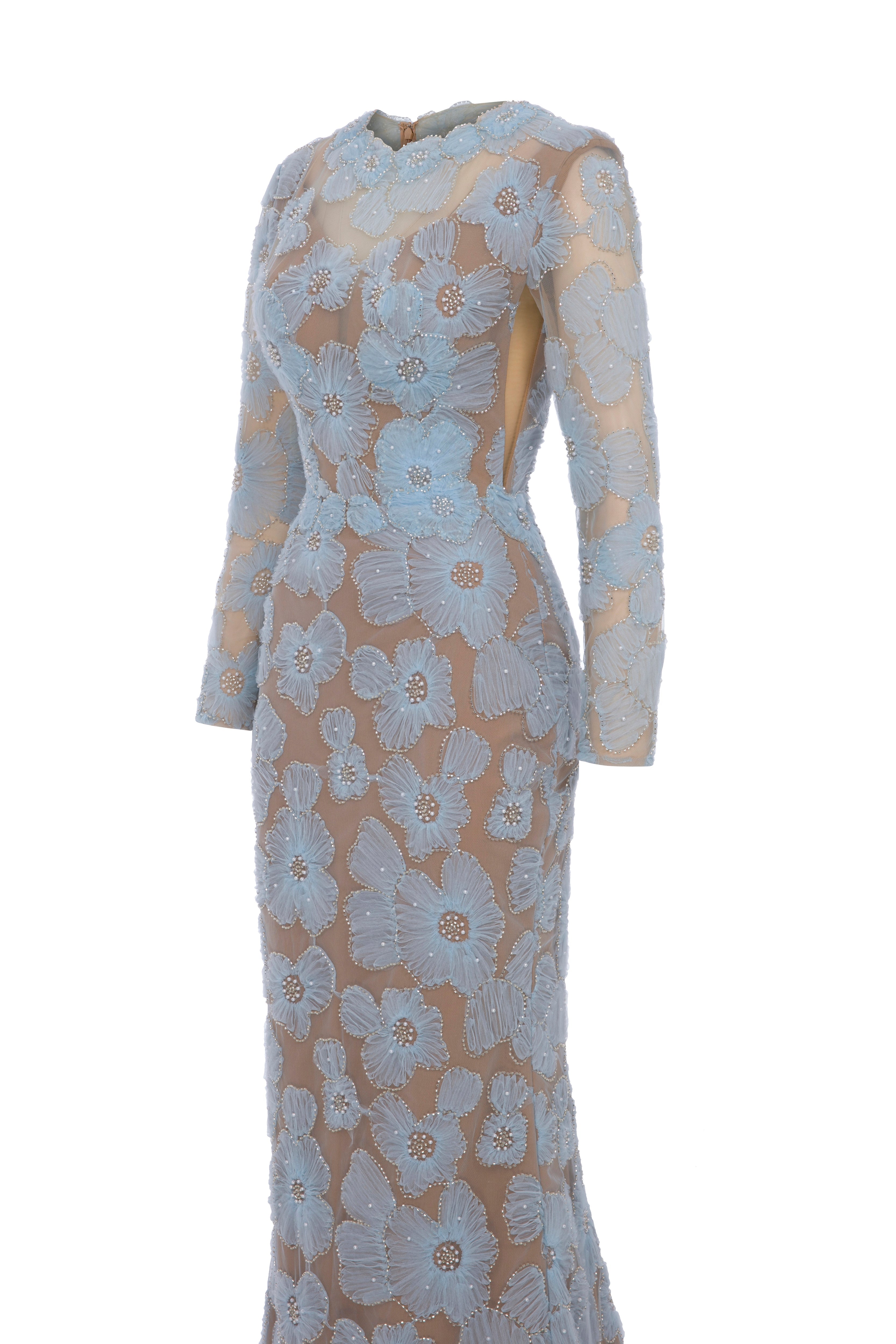فستان راقي مزين بزخارف زهرية زرقاء سماوية على قاعدة بلون البشرة، ليخلق انطباعًا بزهور تتطاير على الجسم. بأكمامه الطويلة الأنيقة وقصته المستقيمة، يجسد هذا الفستان توازنًا مثاليًا بين الأناقة والرومانسية العصرية.