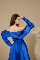 A regal couture gown in matte satin, designed with a sculpted corset waist crafted from a basket-weave pattern. The mermaid silhouette enhances the figure with a smooth, architectural finish, while the detachable structured bolero sleeves add couture drama.