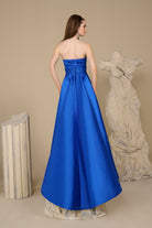 The extended back train falls seamlessly from the waist to the floor, creating a refined, statue-like presence.