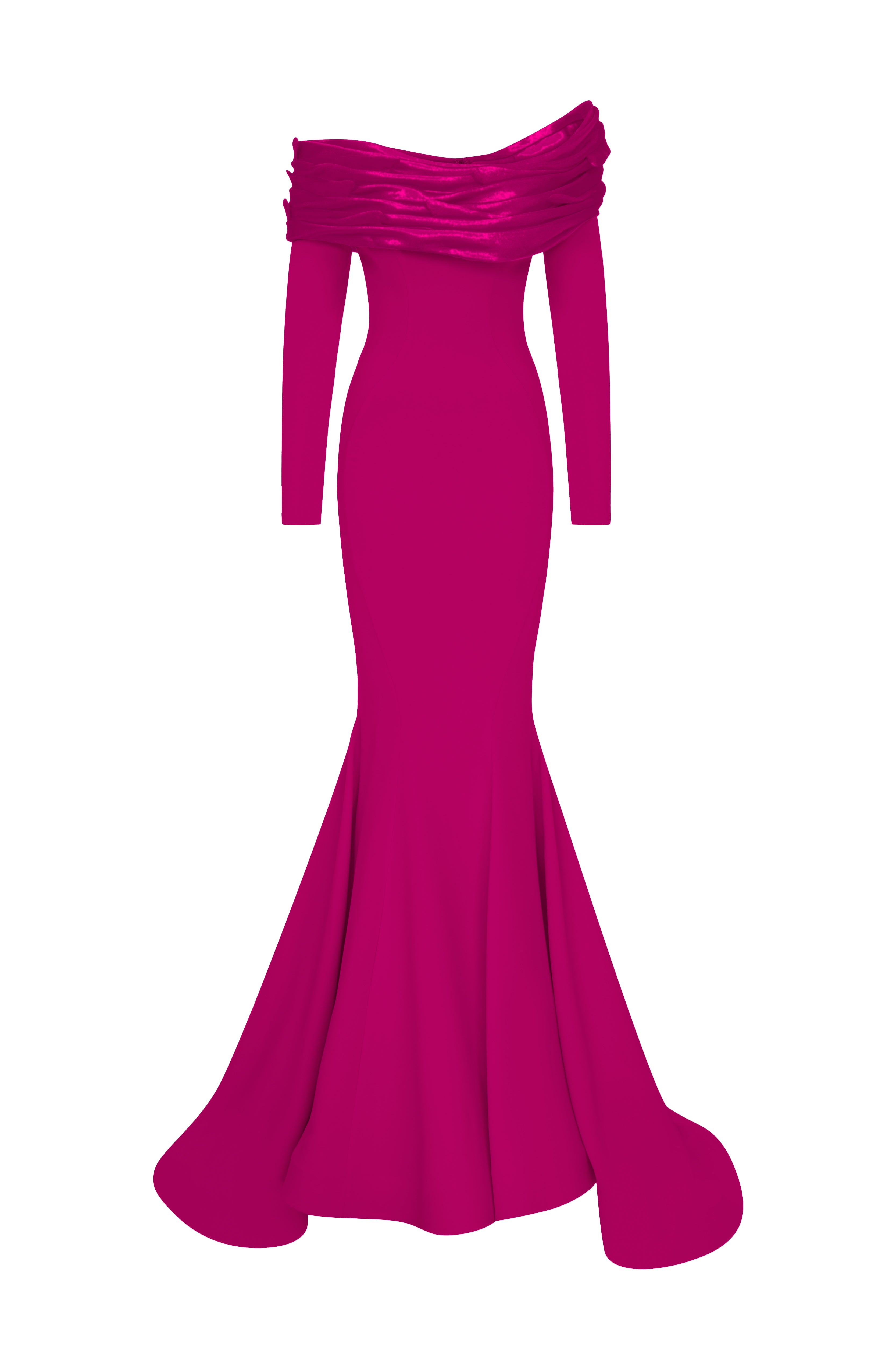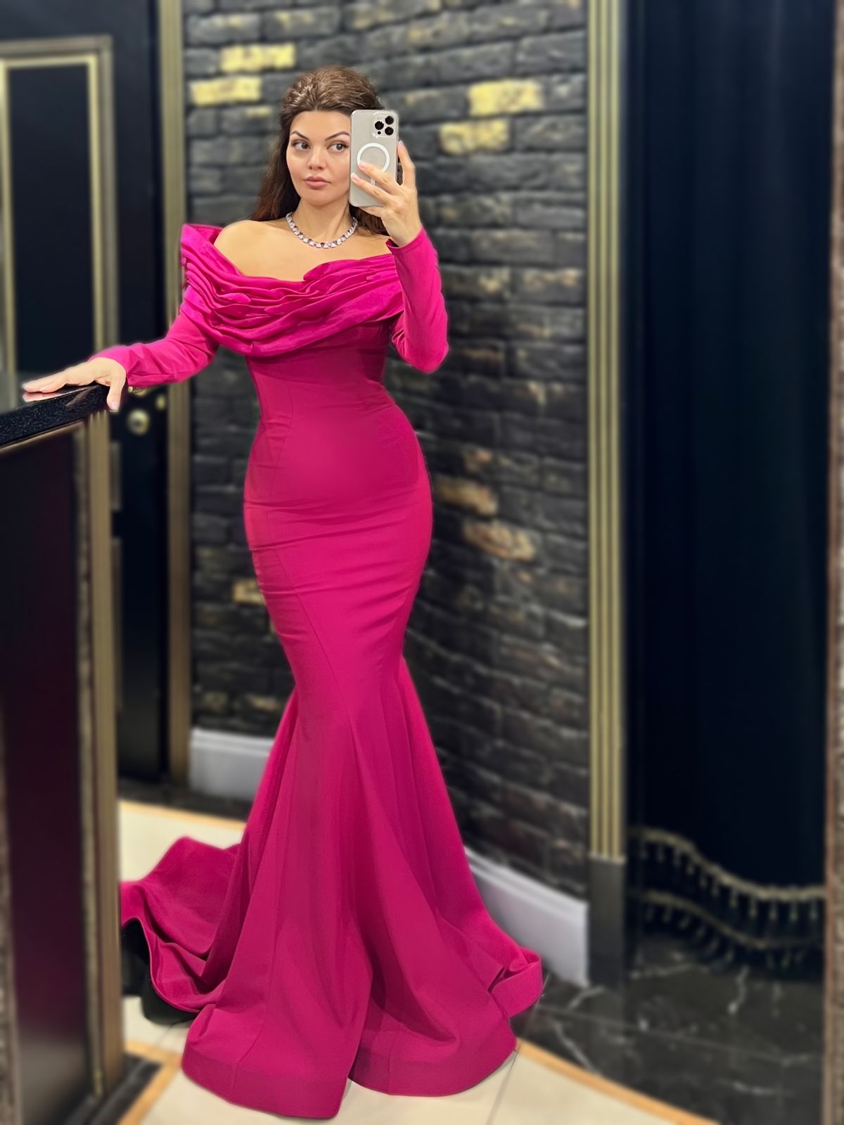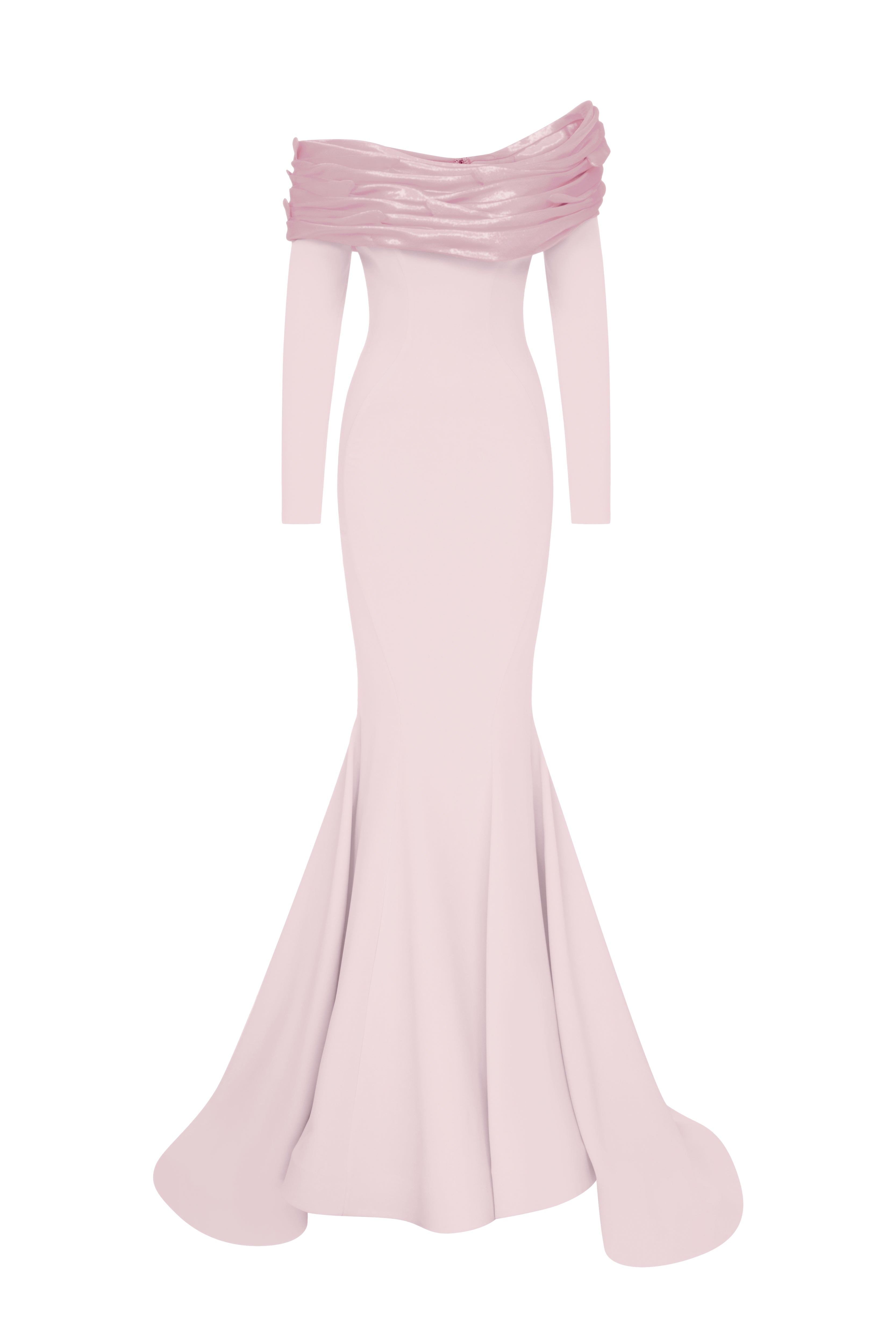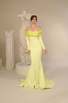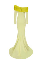 A refined pastel yellow gown designed in a sleek mermaid silhouette. The gown features an off-shoulder neckline adorned with an elegant organza drape across the bust, seamlessly extending into long fitted sleeves. The sculpted design contours the body before flaring into a dramatic floor-length skirt with a soft train, radiating timeless muse-like grace.