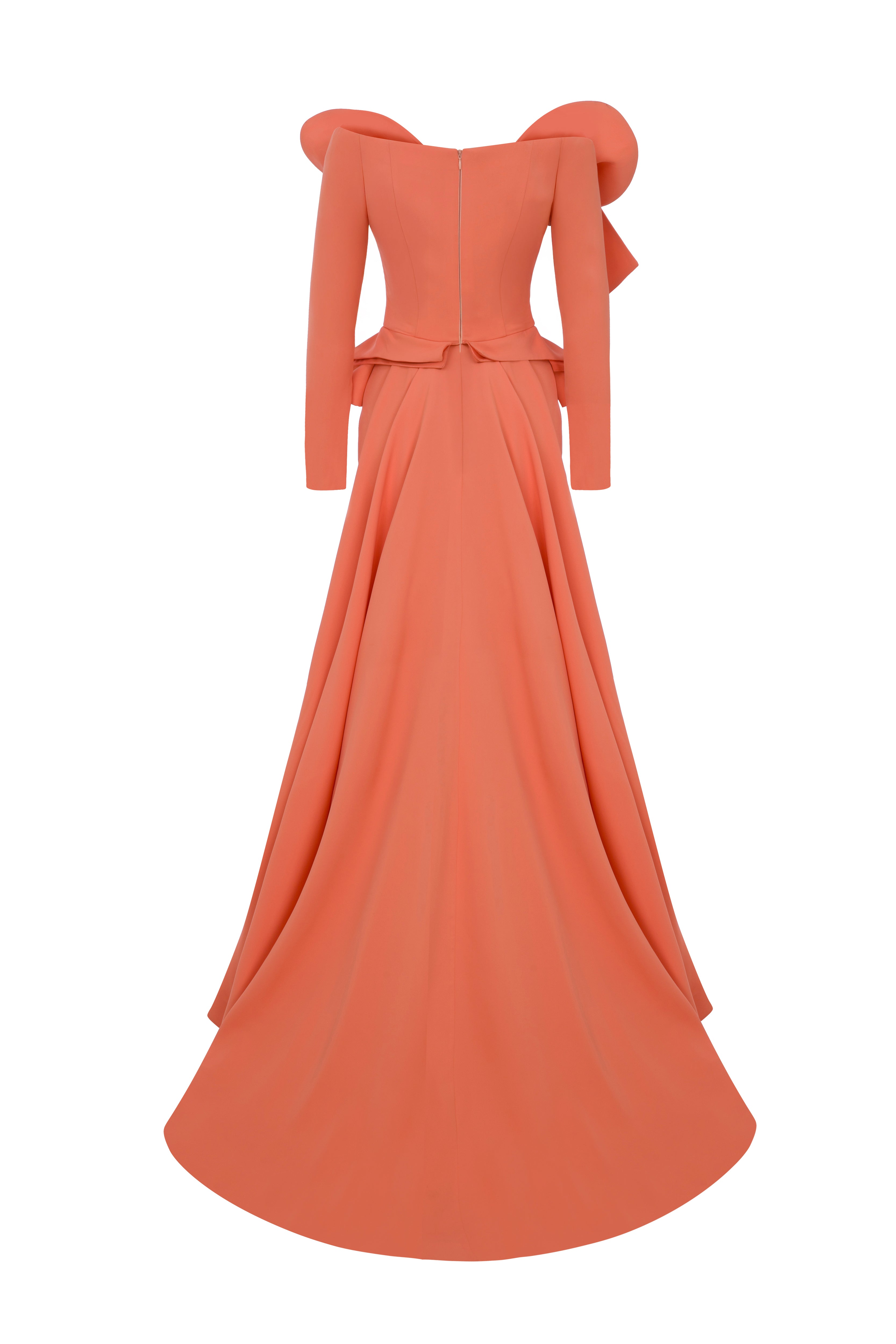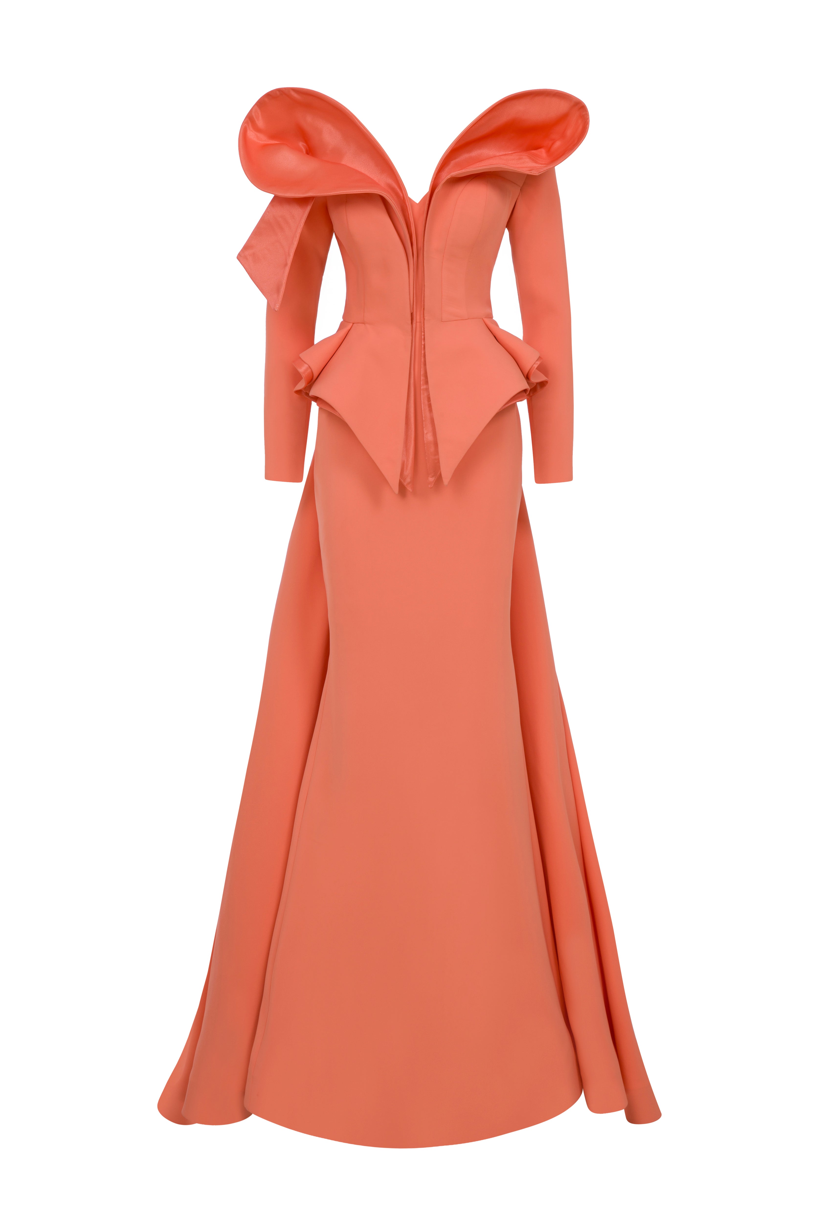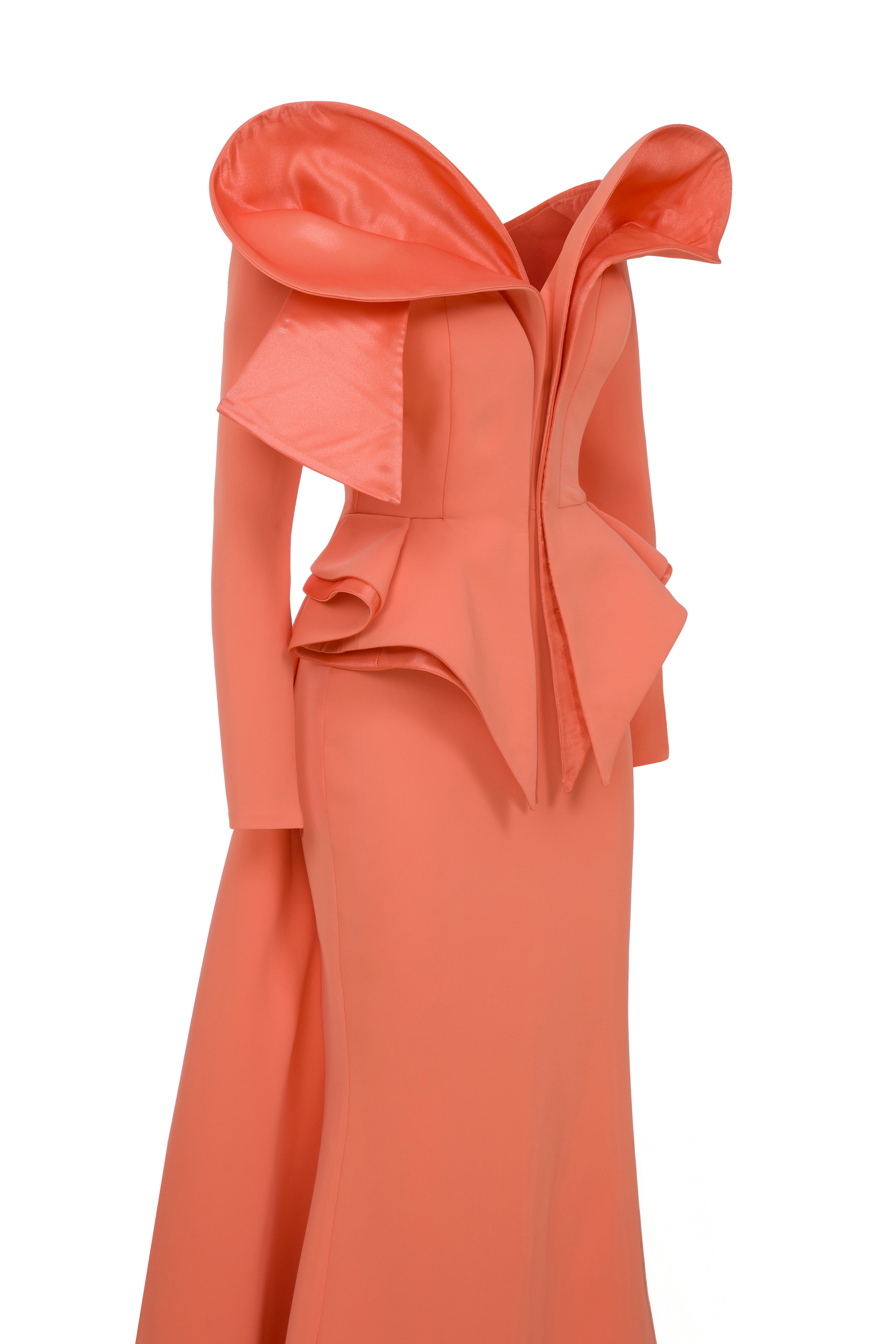 A captivating couture gown in coral crepe, designed with an architectural bodice that blossoms into sculptural folds. The inner chest detail is crafted from matte satin, adding depth and contrast to the structured neckline. With its tailored waist and structured extended back skirt, the gown embodies both precision and fluidity, capturing the essence of modern muse elegance.