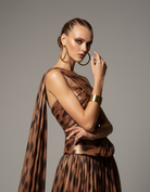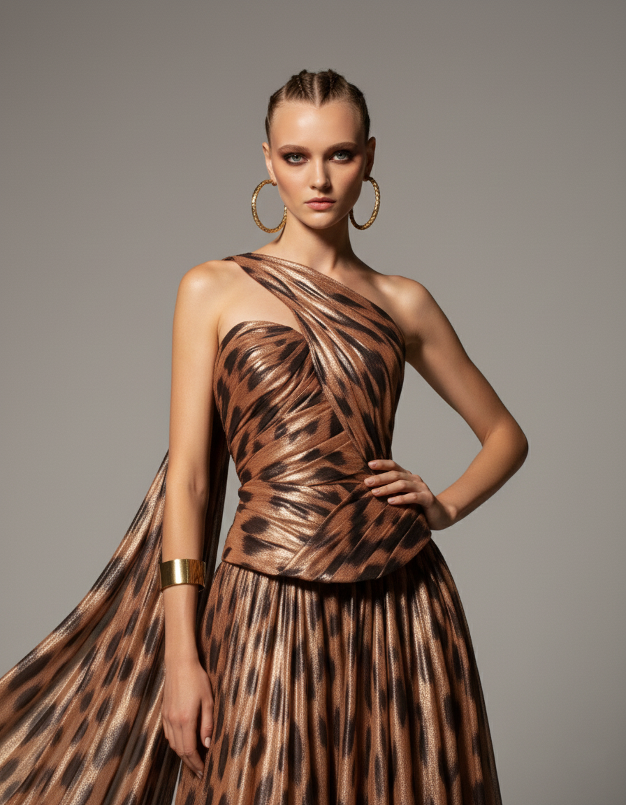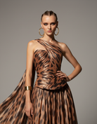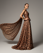 A fiery couture gown that radiates strength and allure. Crafted in glowing orange fabric with a dramatic animal-print drape, the design features an off-shoulder neckline framed by sculpted folds and a black faux-leather corset that sculpts the waist. The flowing train adds depth and movement, evoking the untamed spirit of the desert.