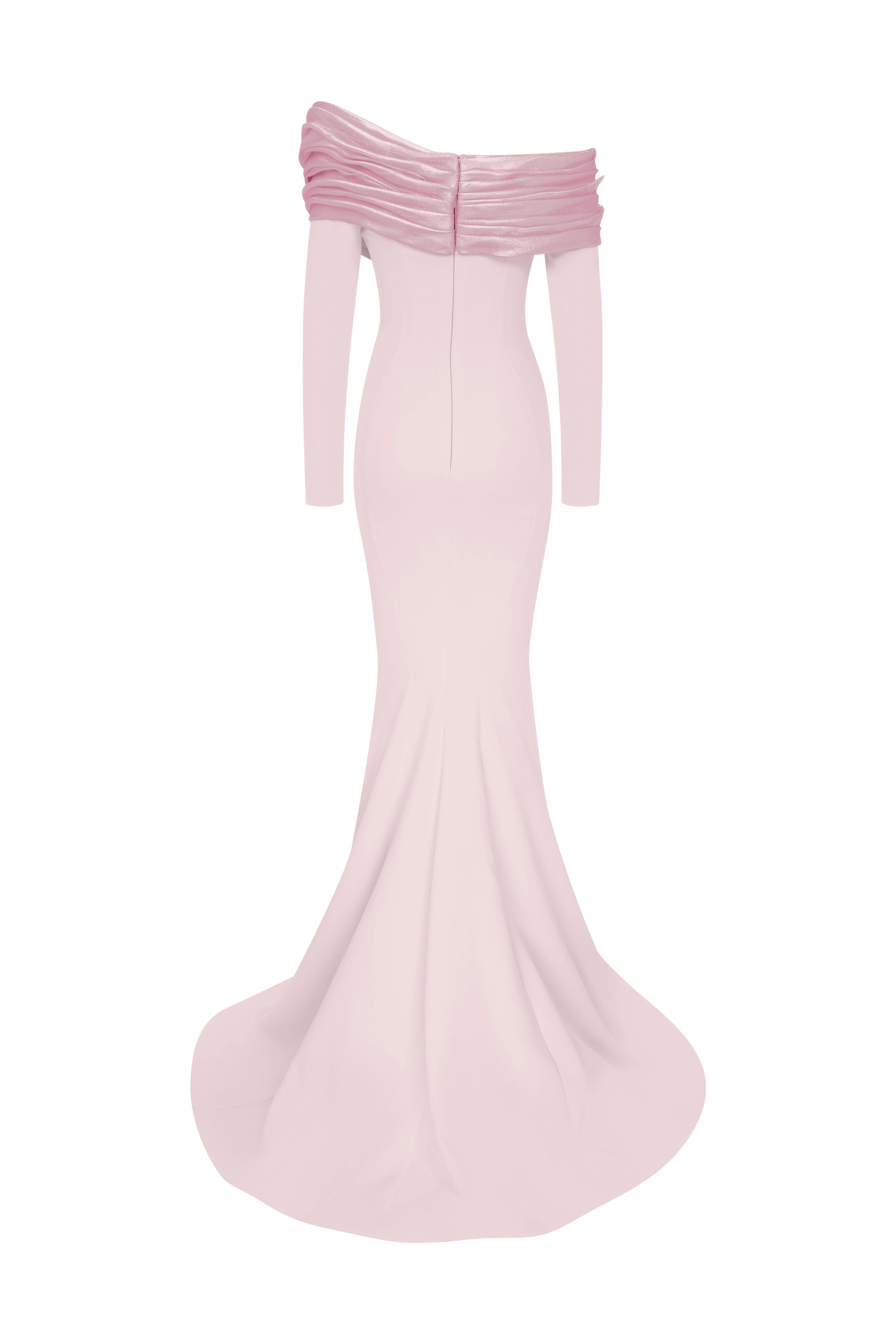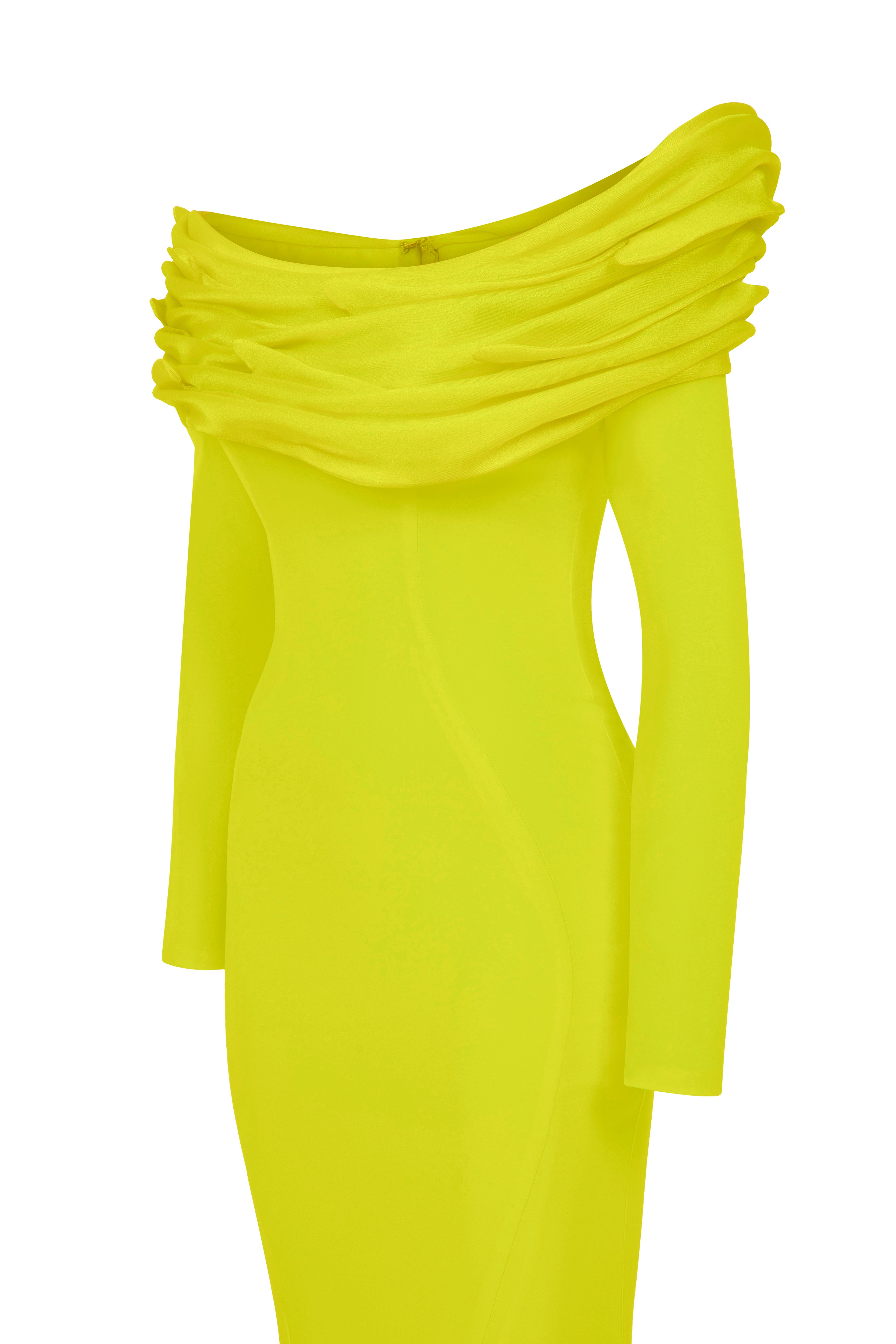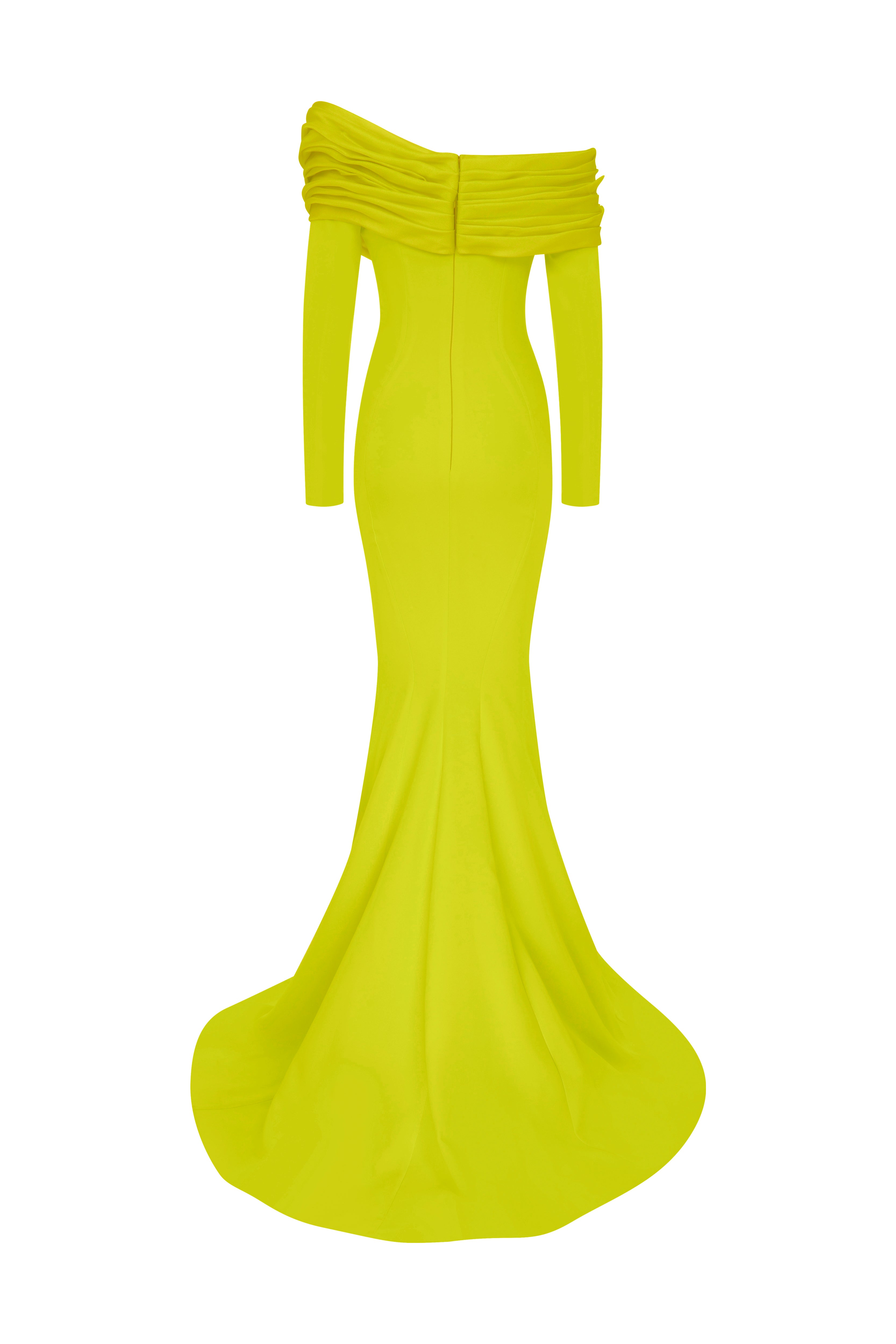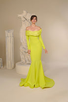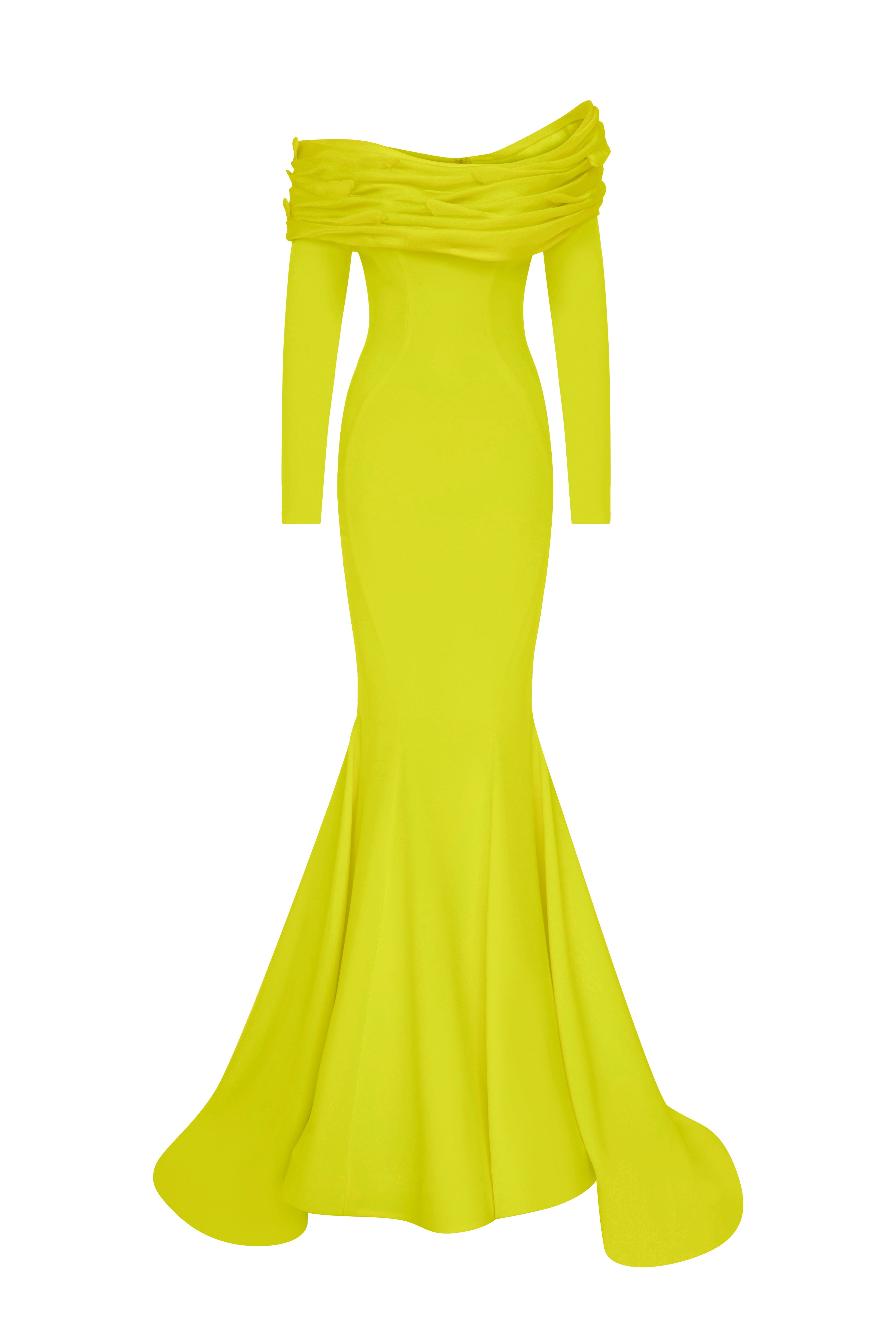 A refined pastel yellow gown designed in a sleek mermaid silhouette. The gown features an off-shoulder neckline adorned with an elegant organza drape across the bust, seamlessly extending into long fitted sleeves. The sculpted design contours the body before flaring into a dramatic floor-length skirt with a soft train, radiating timeless muse-like grace.