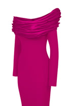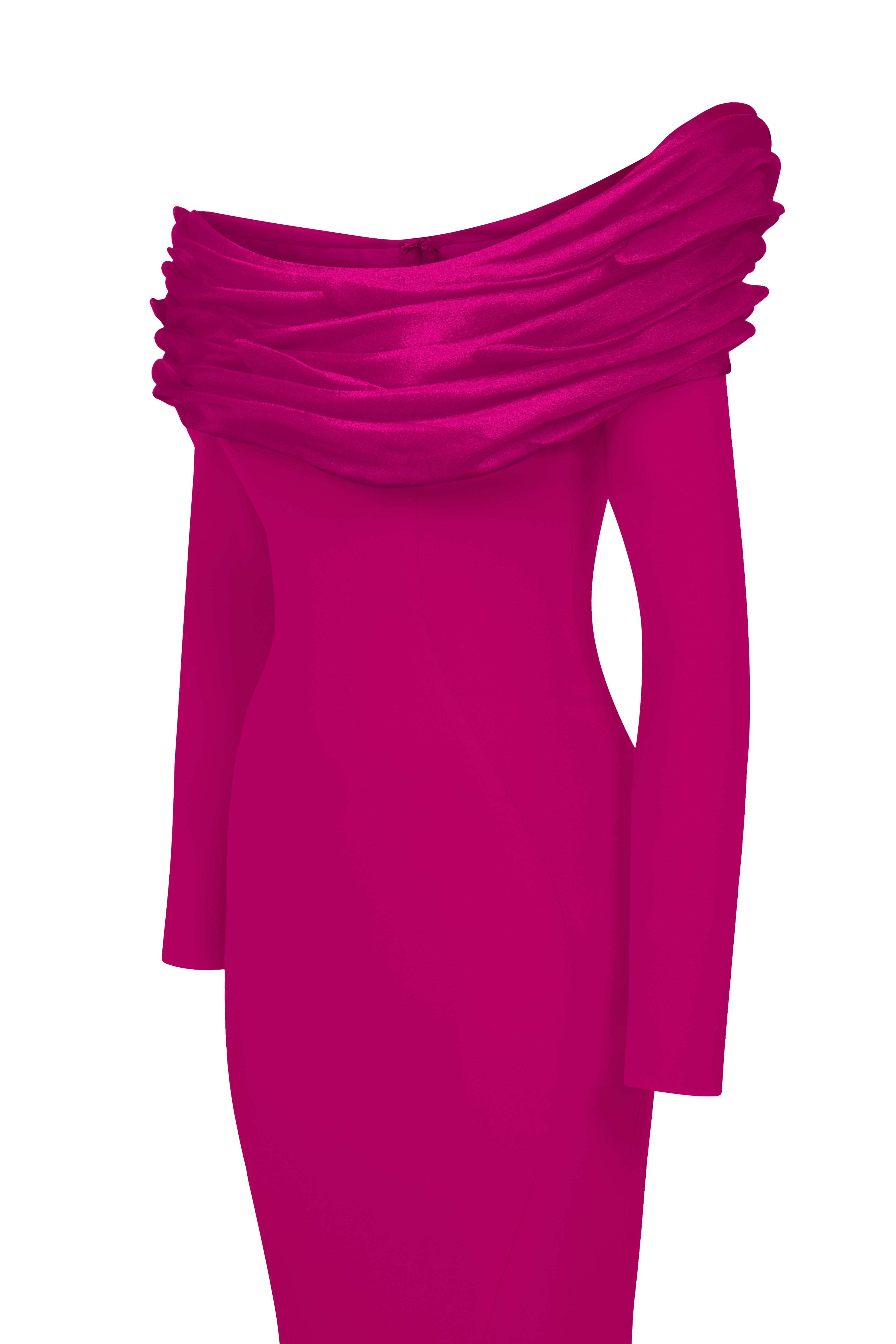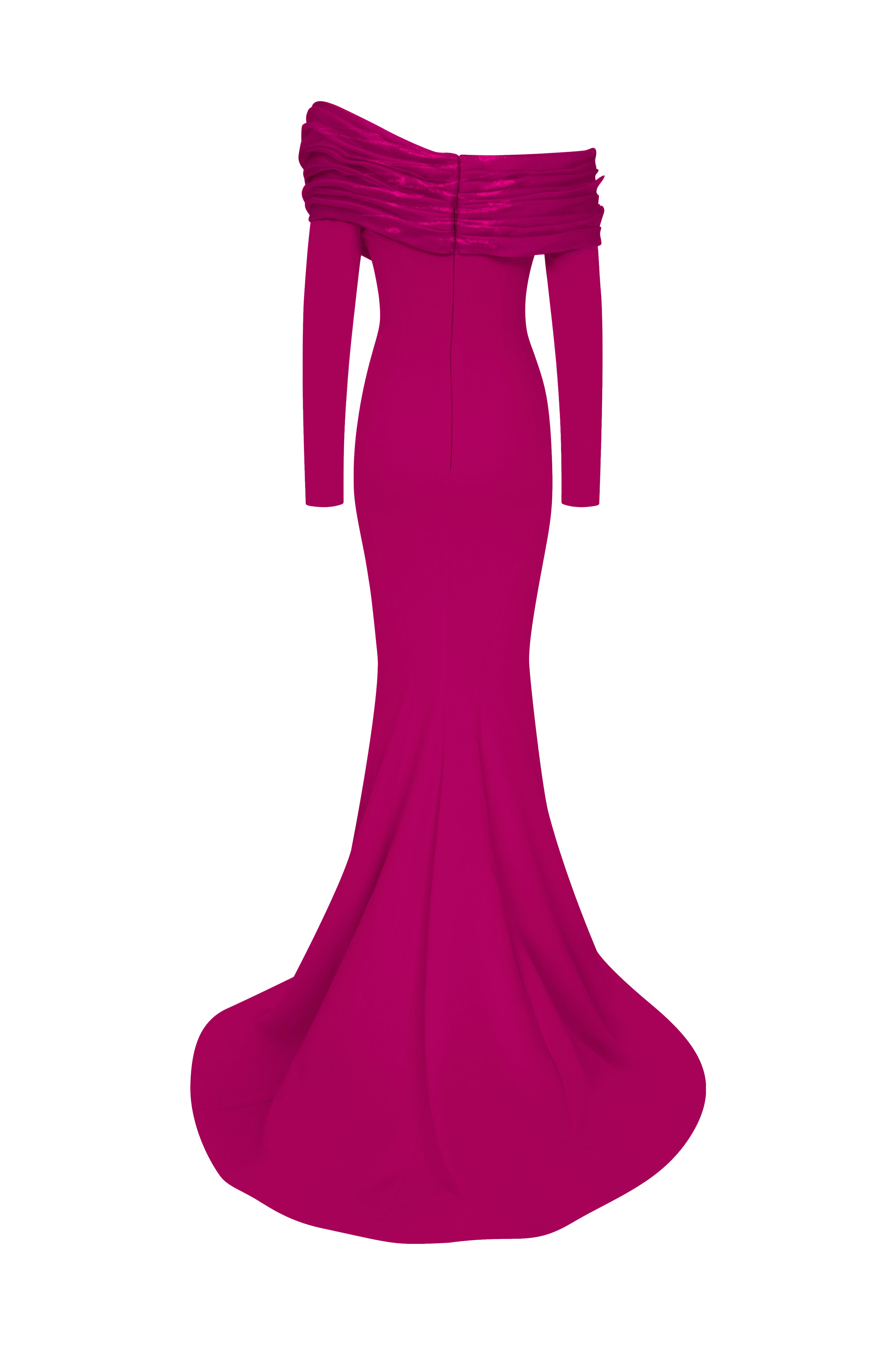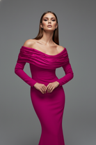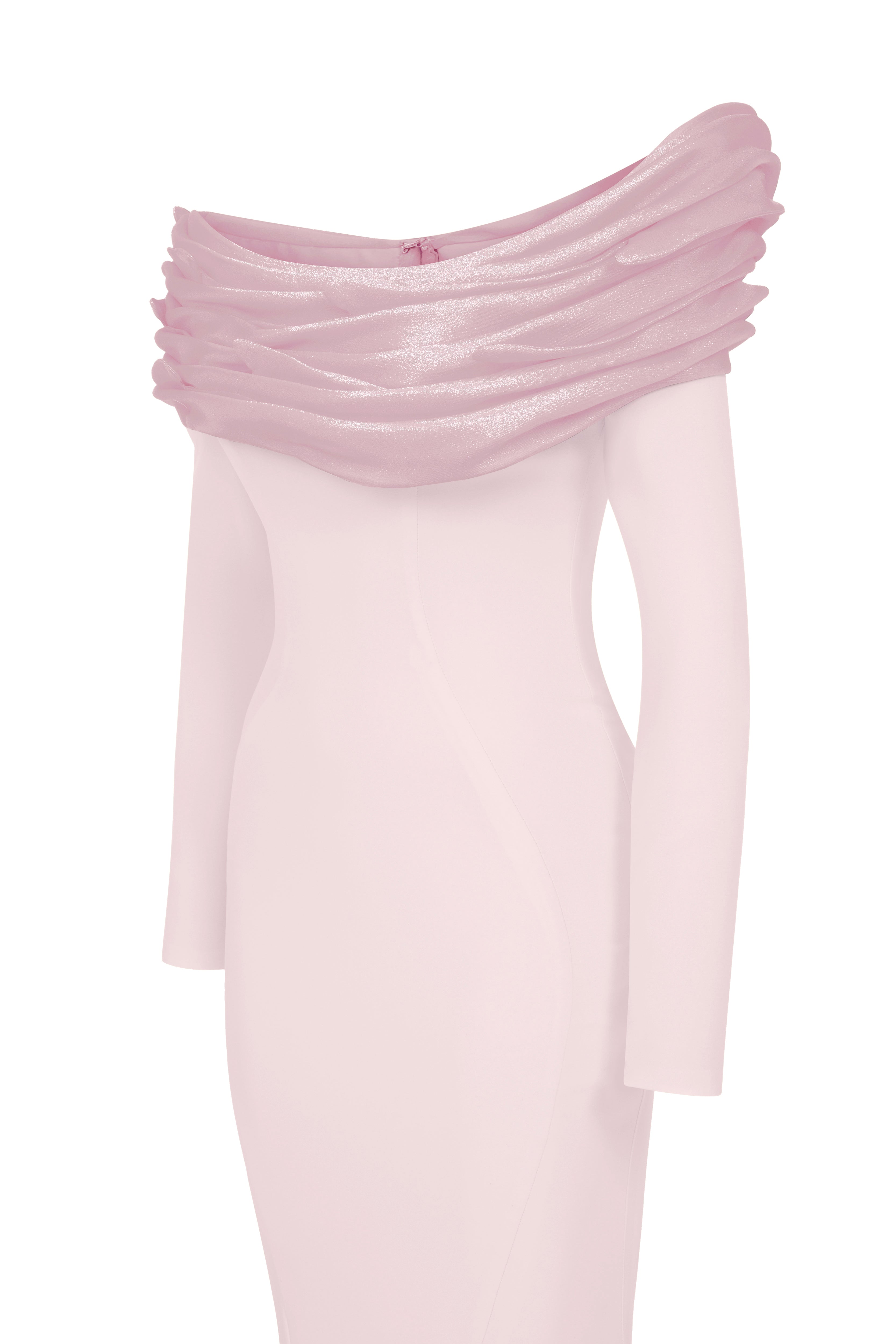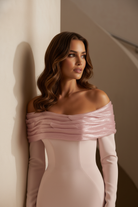 A refined pastel yellow gown designed in a sleek mermaid silhouette. The gown features an off-shoulder neckline adorned with an elegant organza drape across the bust, seamlessly extending into long fitted sleeves. The sculpted design contours the body before flaring into a dramatic floor-length skirt with a soft train, radiating timeless muse-like grace.