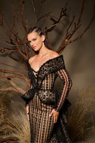 An architectural couture gown in sheer nude tulle, delicately embroidered with black sequins and floral lace motifs. The off-the-shoulder neckline frames the silhouette with sculptural precision, while the fitted bodice and cascading layered peplum create a dramatic sense of movement. Both bold and refined, this gown embodies modern femininity through contrast, texture, and impeccable craftsmanship.