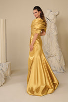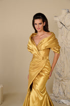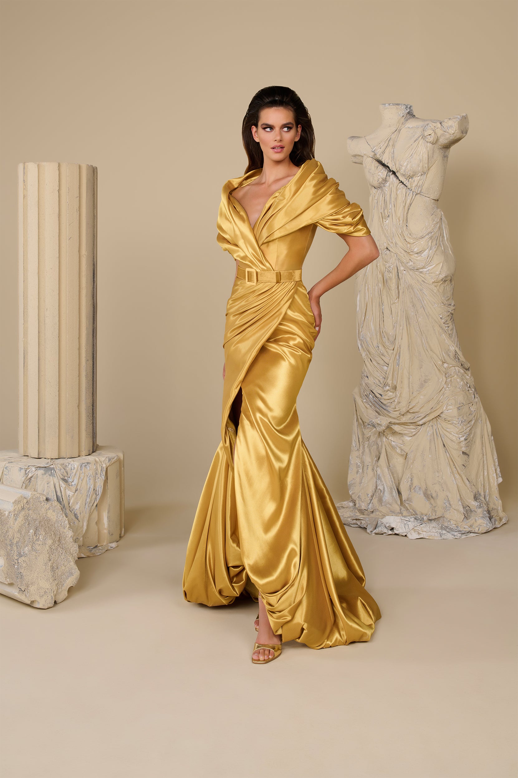 A luminous couture gown in matte royal satin, crafted with sculptural draping that flows like liquid light. The design features a bold off-shoulder neckline, cinched waist with a matching belt, and an elegant front slit that enhances both drama and movement. The gathered mermaid hem adds volume and grandeur, creating a silhouette of timeless allure.