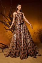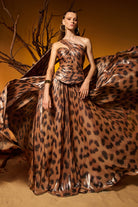 A fiery couture gown that radiates strength and allure. Crafted in glowing orange fabric with a dramatic animal-print drape, the design features an off-shoulder neckline framed by sculpted folds and a black faux-leather corset that sculpts the waist. The flowing train adds depth and movement, evoking the untamed spirit of the desert.