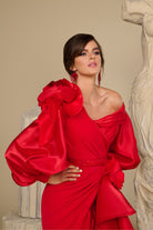 A powerful expression of couture artistry, this red gown embodies sculptural drama and sensual confidence. Crafted from luminous satin, it features an asymmetrical off-shoulder neckline framed by voluminous puff sleeves and a belted waist that defines the silhouette. Cascading ruffles flow from the hip, creating bold architectural movement with every step.