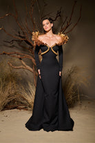 An avant-garde couture gown in black crepe, elevated by sculptural gold detailing that defines its bold silhouette. The off-the-shoulder neckline is adorned with hand-crafted metallic ruffles that bloom around the shoulders like molten petals, while a sinuous gold structure traces the bust and waist, emphasizing the feminine form.