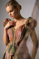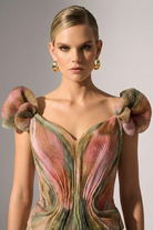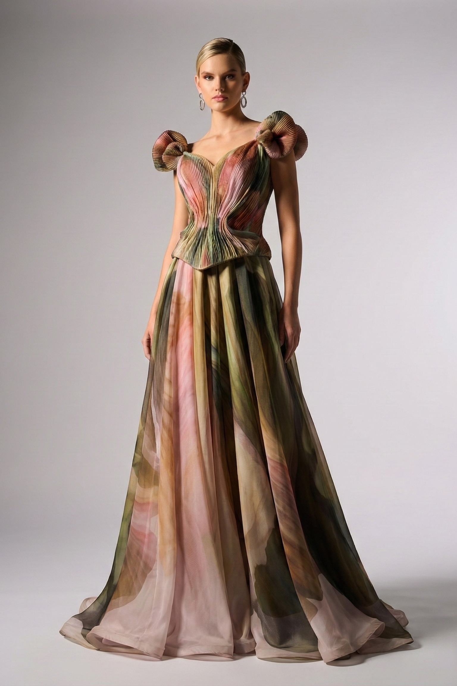 This ethereal gown is crafted from soft pastel-toned flower-printed chiffon, flowing with an artistic watercolor effect. Its sculptural corset is built with meticulously pleated, wavy chiffon panels that shape the bodice in a petal-like form, creating dimensional structure and romance.